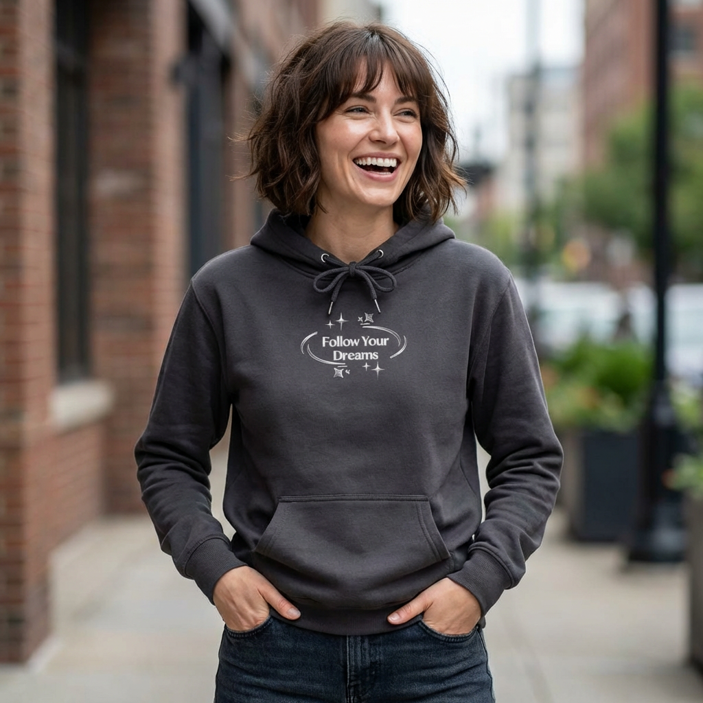 Slip into a soft, midweight hoodie that feels like a quiet night under the stars. The charcoal fleece carries a subtle, hand-drawn “Follow Your Dreams” motif surrounded by tiny sparkles — understated but full of intention. Wear it on late-night walks, study sessions, or while sketching new plans; the jersey-lined hood and adjustable drawcord give a cozy, adjustable fit while the roomy kangaroo pocket keeps your hands warm and your essentials close. Durable double-needle stitching and ribbed cuffs hold their shape through repeated wear. This is the kind of sweatshirt you reach for when you want comfort and a gentle reminder to keep moving toward what matters.