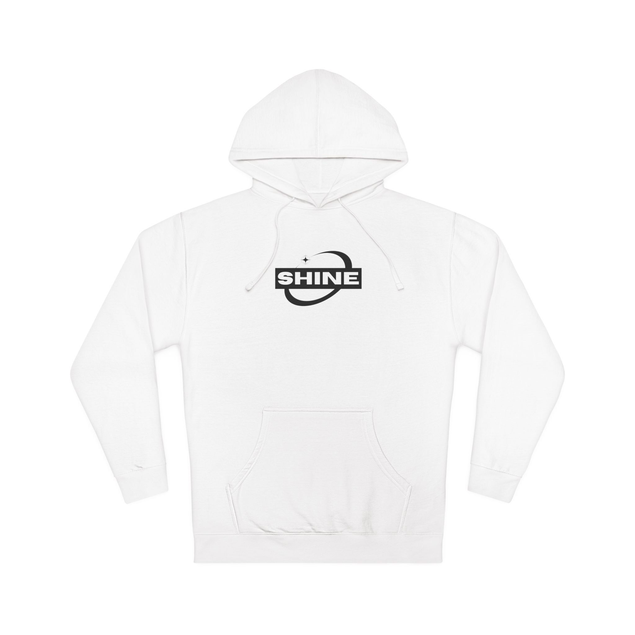 A clean, cozy hooded sweatshirt that speaks quietly but confidently. The white fleece anchors a bold, minimal logo across the chest—an emblem that reads "SHINE" inside a ringed planet motif—giving off subtle streetwear energy with a retro sci-fi twist. The mid-weight fabric and jersey-lined hood feel familiar and warm on cool mornings and late-night walks. Wear it layered over a tee for city coffee runs, or pull it on after studio sessions to keep the creative momentum going. It’s for people who like simple, thoughtful design and clothing that moves with their day.